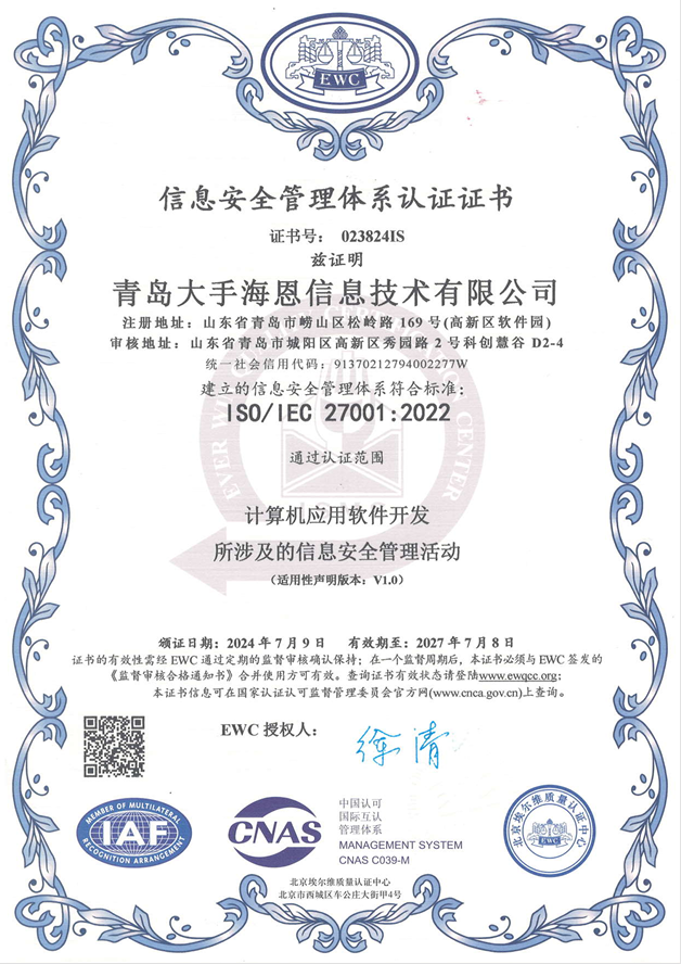 作为深耕信息技术服务领域的企业,大手海恩始终将信息安全管理视为企业发展的生命线。十余年来,公司严格遵循ISO27001标准框架,将信息安全管理要求深度融入业务流程,为客户提供更安全、更可靠、更高效的数字化解决方案。